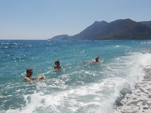 Либо направо, к трём островам (читайте про них ниже, в разделе "Дайвинг"), в бухту Маден и пляж Клеопатры. Пляж Клеопатры, увы, это большая помойка около Текировы :( Но там мелко и песочек, было бы чисто - было бы идеальное место для плавания с малышами. А вот бухта Маден очень красивая и интересная, я уже писала про неё выше.