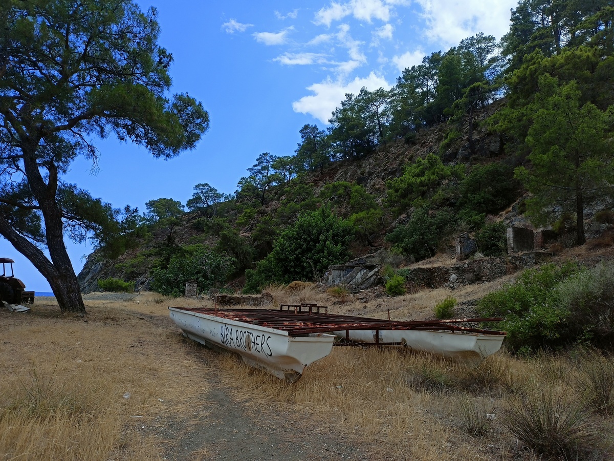 А если продолжить путь вдоль моря и перевалить через еще одну горку, выйдете уже в широкую долину - бухту Маден. Тут есть заброшенная штольня с летучими мышами, останки трактора и катамарана и развалины дома.
