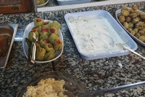Почти все отели подают на завтрак черные и зелёные оливки собственного посола и варенье, которое сами варят из фруктов, растущих в отеле или в принадлежащих владельцам отеля садах. А еще - противный, но супер-полезный сироп кэроба. Чтобы сироп кэроба стал съедобным, купите тахини (паста из кунжута) и смешивайте, на вкус получается, как халва, только намного полезнее :)