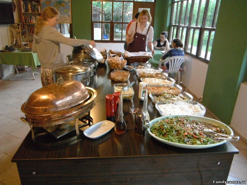 Ужин прекрасный! Множество овощных салатов-закусок, суп, три горячих блюда из овощей и бобовых, гарнир (спагетти или рис или булгур), и одно мясное блюдо (или рыбное). Не смотря на то, что мясное только одно, его достаточно и хватает на всех, и делают очень вкусно! Один десерт, фрукты.