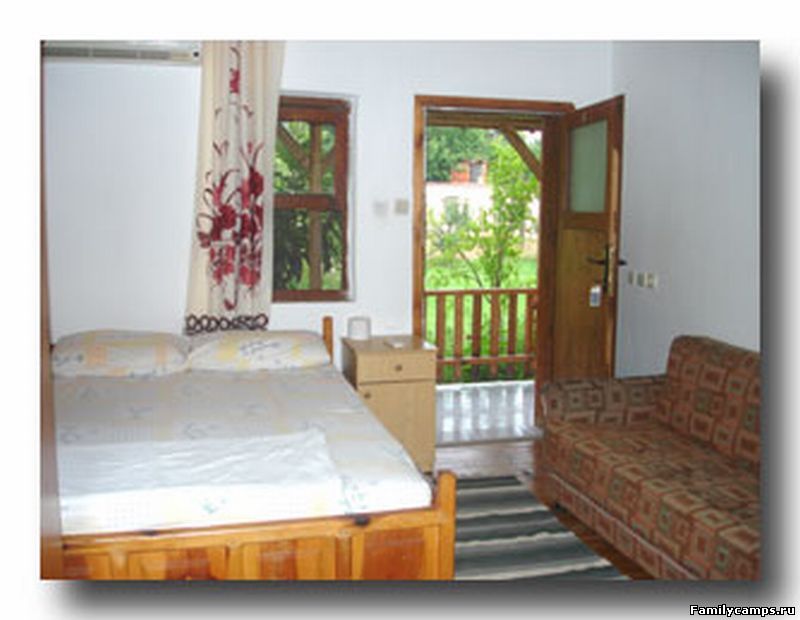 Часть номеров расположена в отдельностоящих деревянных домиках - бунгало. Есть трехместные, четырехместные домики.