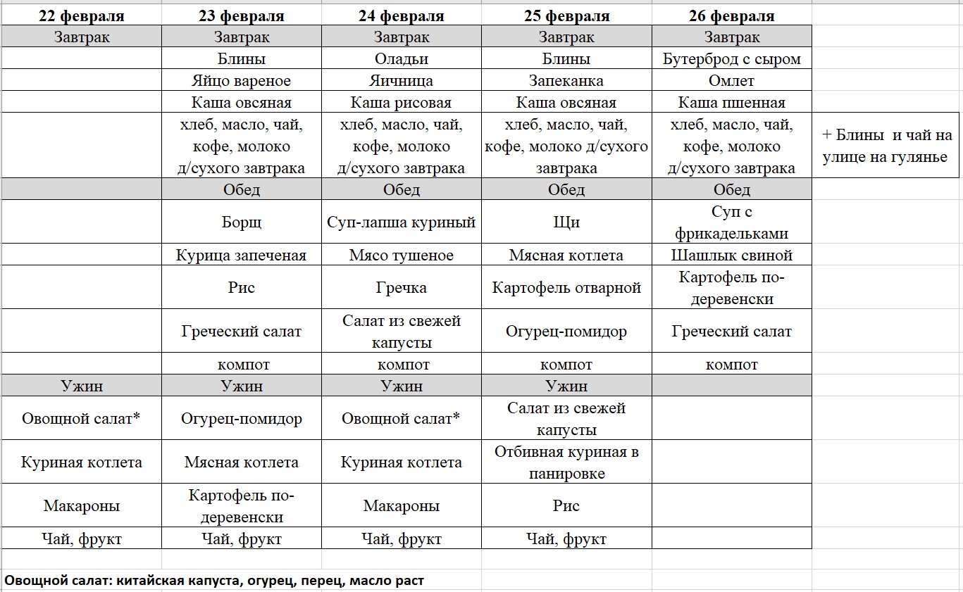 Стоимость питания в сутки составит 900 руб в сутки за одну порцию, не важно, для взрослого или для ребенка. Можно взять меньше порций, чем человек в семье. Доплата за 26 февраля - 300руб (увеличенная порция шашлыка и блины).