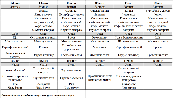Вот примерное меню на лагерь: