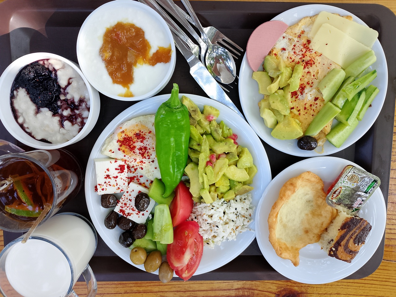 На завтрак специально для нас будут варить молочные и безмолочные кашки. Еще на завтрак - прекрасный натуральный йогурт, вареные яйца, омлет-яичница по запросу, сыр разных видов, свежие овощи, оливки, домашнее варенье, мед, пончики. Осенью также часто дают авокадо.