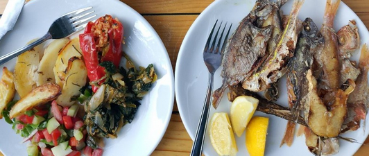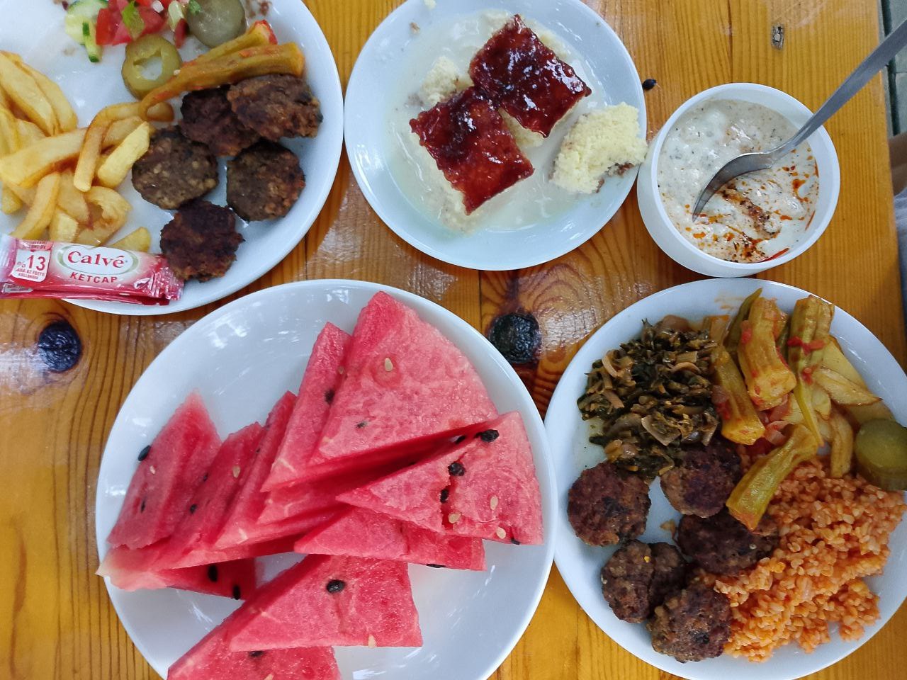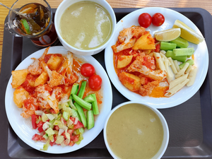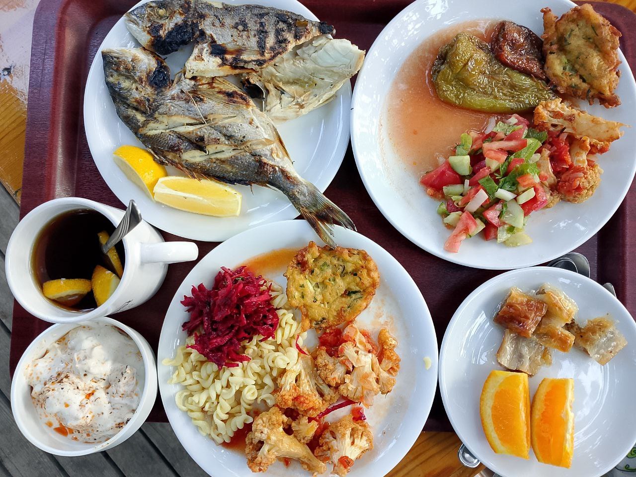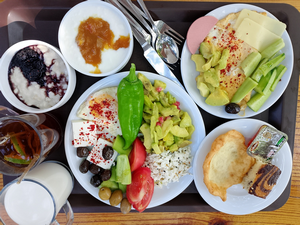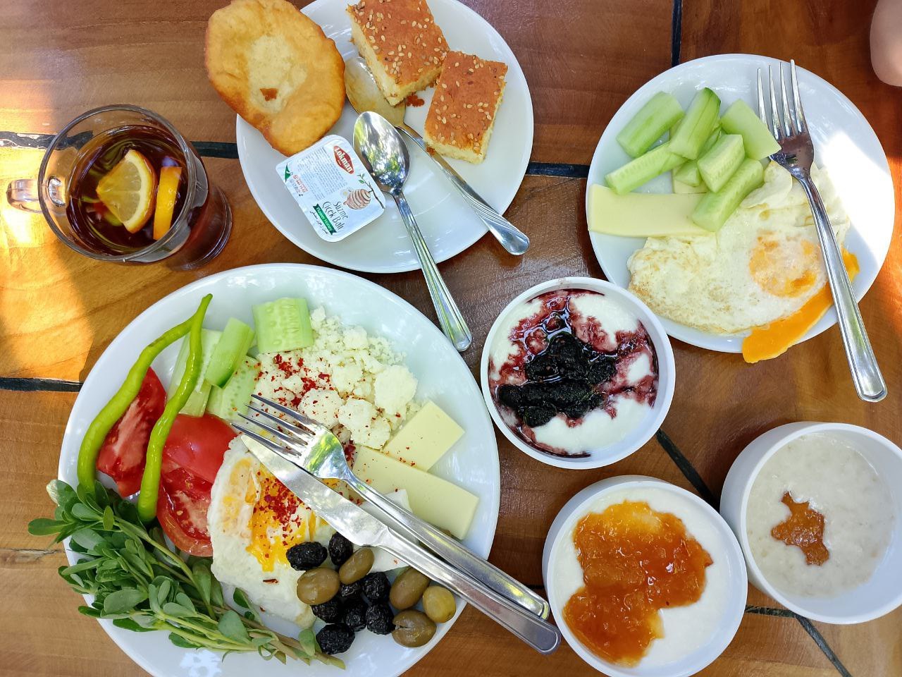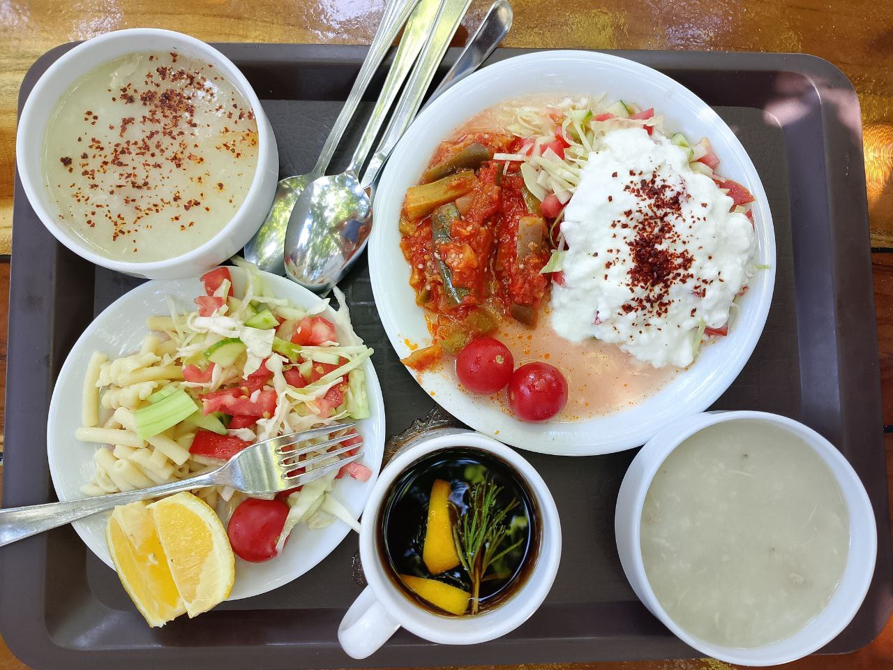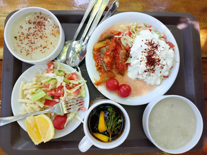 Обед очень простой: суп (чаще овощной, но иногда куриный), простой овощной салат, одно горячее овощное блюдо, рис/булгур/спагетти и натуральный йогурт. По жаре этого хватает даже мужчинам. Но если не хватает, можно заказать мясное блюдо за деньги.