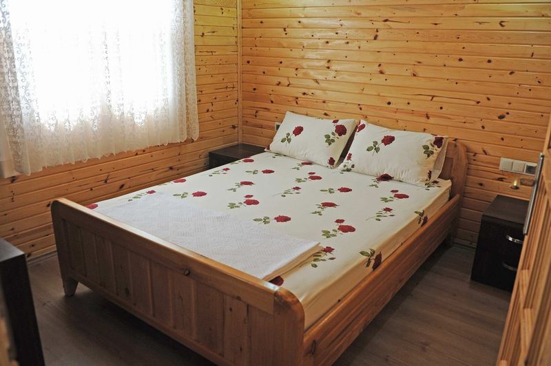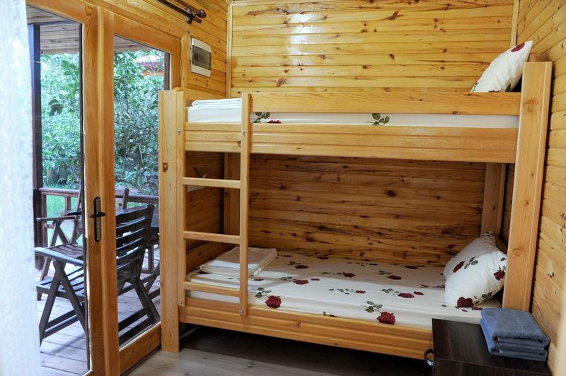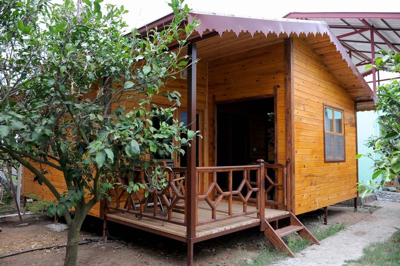 Часть номеров расположена в отдельностоящих деревянных домиках - бунгало. Есть трехместные, четырехместные домики.