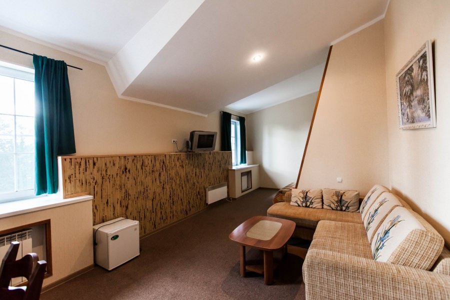 Большая часть номеров, где будут жить участники лагеря, расположена в главном здании. Тут есть стандартные номера, один номер-студио, два полулюкса и один двухкомнатный люкс. Во всех номерах есть санузел с душем или ванной, кровать (одна двуспальная или две односпальных), диван, который раскладывается в двуспальный и является дополнительным спальным местом, холодильник. Номера чистые, уютные, светлые, красивые и достаточно просторные (даже стандартные), полностью соответствуют фотографиям. Новые хорошие матрасы, одеяла, подушки, сантехника. В любой номер можно добавить детскую кроватку-манеж или еврораскладушку с полноценным матрасом.
