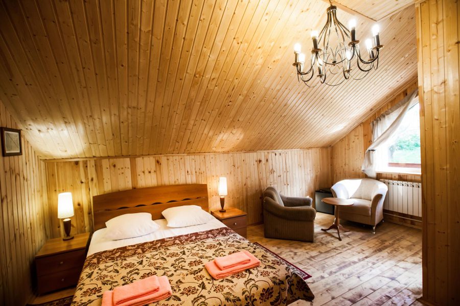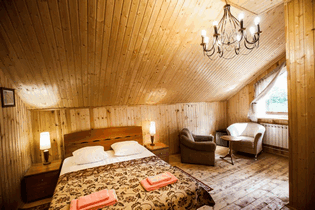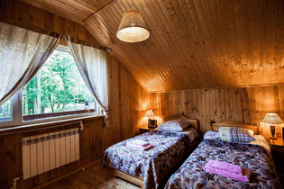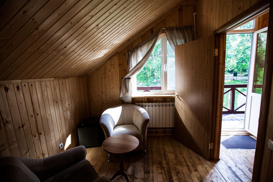 Можно также разместиться в деревянных домиках - шале. Двухкомнатные четырехместные номера шале расположены на втором этаже.