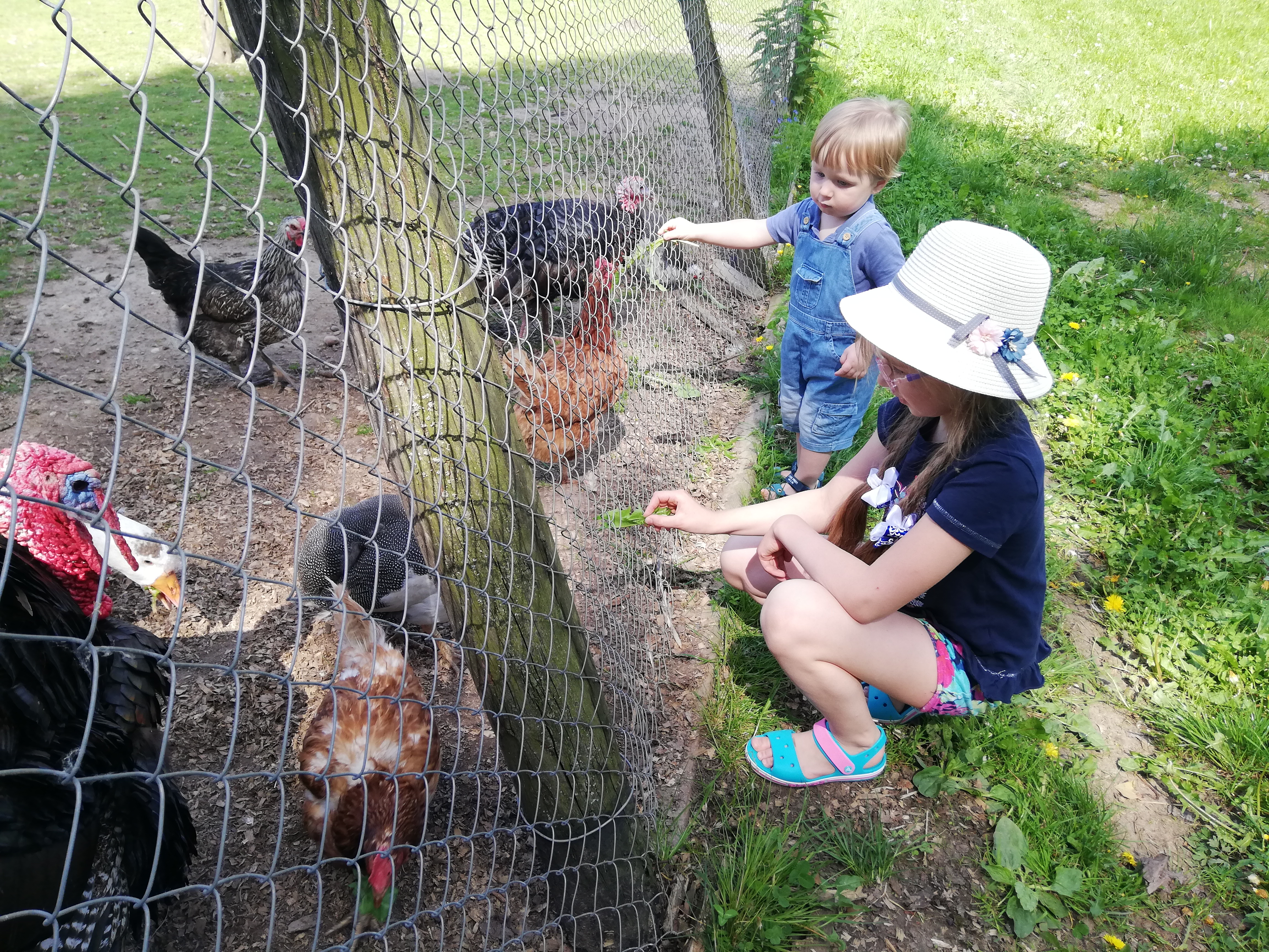 Перед домом – футбольно-волейбольное поле. Устроена детская площадка, веревочный городок и обожаемая детьми чудо-карусель. Есть большой птичий двор, козы, пруд, полный рыбок, и всех можно кормить! На озере можно покататься на лодочке. А в доме – большая игровая комната.